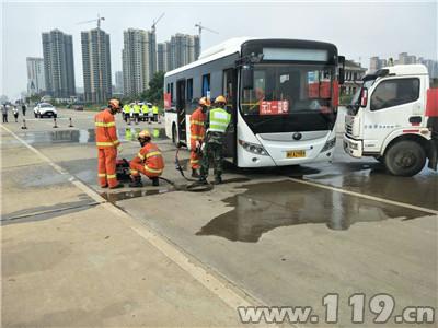 演练于下午15点30分开始,演练假设一辆满载危化品的罐车由南往北跨越双黄线行驶时,与由北往南直行未及时减速避让满载乘客的大客车相撞,大客车上有多名乘客受伤,两车受损,大客车驾驶楼移位(司机被压),大客车着火,危化车有泄露的危险。车上乘客第一时间拨打“122”交通报警电话及“120”急救电话,并组织开展自救逃生。沅江消防接到“122”的应急救援指令后,按照道路交通应急演练实施方案,第一时间进行疏散营救,同时,调动沅江消防2台消防车,12名消防官兵,前往现场进行火灾扑救及紧急救援,并请求市政府启动了沅江市重特大道路交通事故应急预案,迅速调集120急救、公安(巡特警)、交警、安监、环保、交通运输、气象、商务、保险等部门、行业有关人员迅速赶赴现场。
