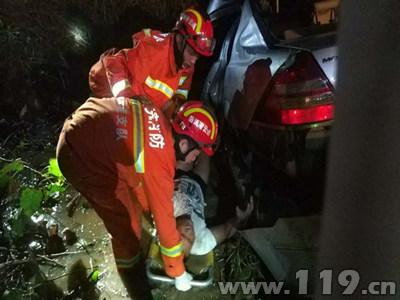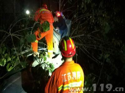 7月12日凌晨1时56分,江苏省连云港市东海县消防指挥中心接到报警称:位于G30高架桥下曹林村路段一辆轿车撞到树上,有人员被困。接警后,中队立即出动1车6人赶赴现场处置。
