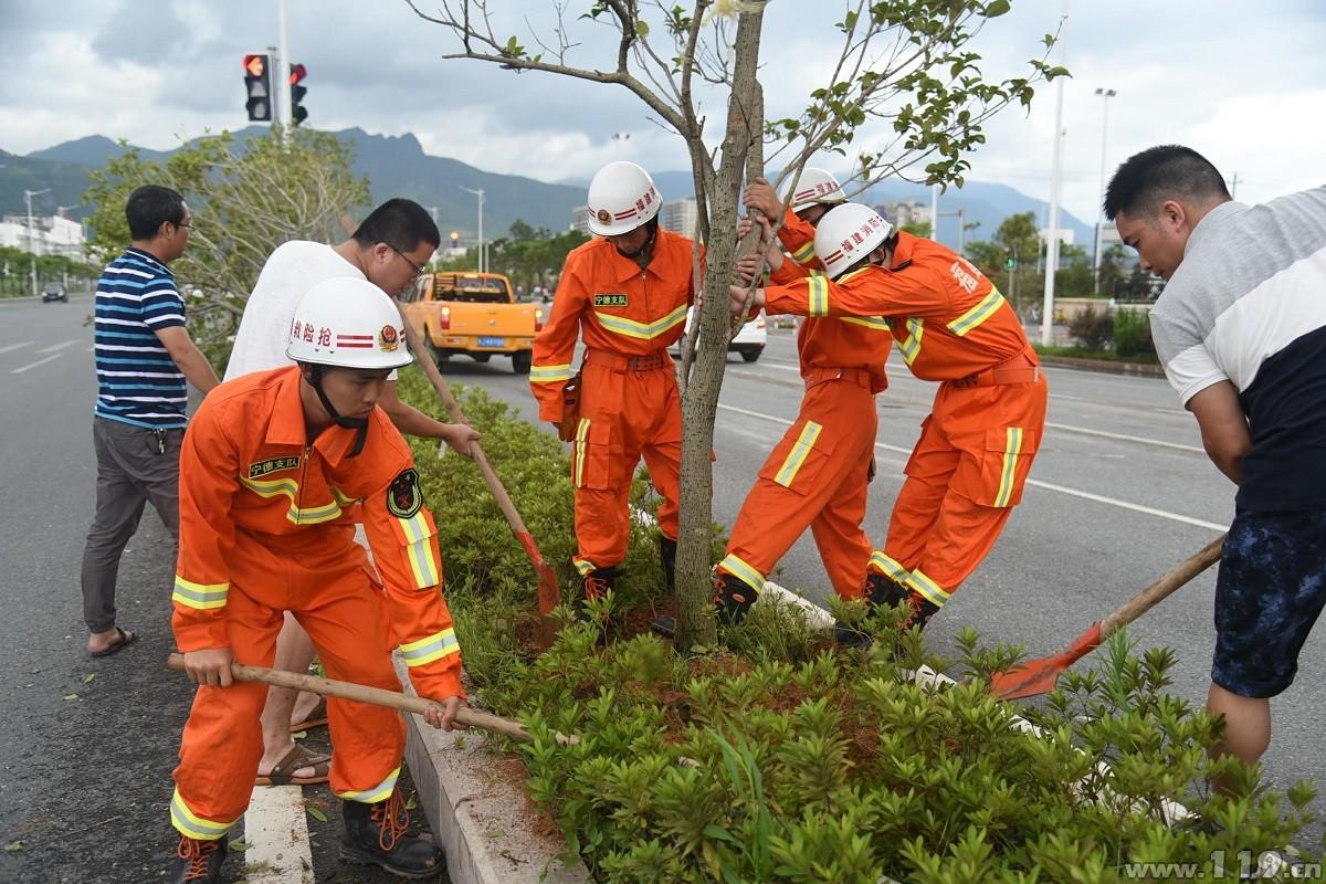 当天,消防官兵联手部门工作人员一起完成了道路行道树、街头绿地的树木清理、扶正工作,及时排除了安全隐患,确保道路的交通畅通。