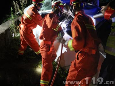 凌晨02时57分,救援官兵抵达现场,交警已对事故路段进行交通管制,只见事故现场一辆白色轿车撞在路边,由于剧烈的撞击,导致轿车车头严重变形,司机的双脚被死死卡在车内动弹不得,表情十分痛苦。指挥员根据现场情况立即下达作战命令:第一组由2名官兵配合交警立即设立警戒带,对来往车辆进行交通管制,防止造成二次交通事故;第二组2名官兵负责进行照明,方便施救人员进行救援;第三组由2名官兵负责利用液压剪扩钳等破拆工具对轿车驾驶室进行破拆。在破拆过程中,由一名官兵不断与被困者进行交谈,转移其注意力。经过将近1个小时的奋战,救援官兵成功将驾驶室进行了破拆,扩大救援空间,将被困人员救出,并将其交予现场医护人员进行救治。
