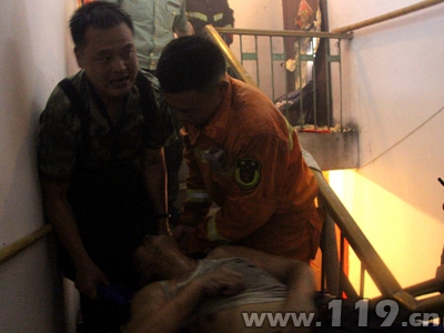 由于医护人员还未到达现场,而老人吸入浓烟后口腔和鼻腔内尽是黑色杂质,脉搏和呼吸也十分微弱,现场带队指挥员周飞立即决定对昏迷老人进行现场急救,他让两名消防员帮助将老人的头部托起后用手扒开老人的嘴,清理嘴里和鼻腔异物,避免老人窒息,同时对老人实施人工呼吸和心肺复苏按压。经过两分钟左右的急救,老人的心跳、脉搏和呼吸有了明显变化。随后,中队官兵在120急救车到达后将老人送往医院进行救治。
