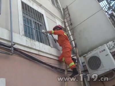 消防队员赶到现场,经询问得知小孩被困在二楼,因为设有防盗窗导致人员无法直接进入屋内。由于无法观察小孩在房间里的情况,孩子的家人都非常着急。在了解情况后,现场指挥员立即组织救援,一名消防队员爬上梯子,然后将防盗窗卸下,随后进入房间内将房门打开。所幸被反锁在家中的儿童没有受伤,看到小孩被成功救出,在场所有人都松了口气。