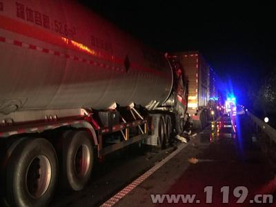 中队消防官兵到达现场后,发现一辆槽罐车追尾撞上了一辆厢式货车,槽罐车车头严重变形,司机被困在驾驶室内无法动弹。